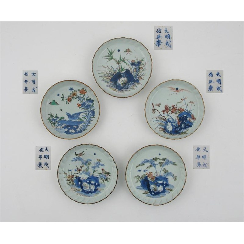 Five Chinese wucai moulded dishes, six character Chenghua marks but mid 17th century. Decorated with birds perched or in flight amidst flowers and rockwork, one with a crouching hare, and another with a large insect, 14.5cm. Contained in a modern wooden case. (5)