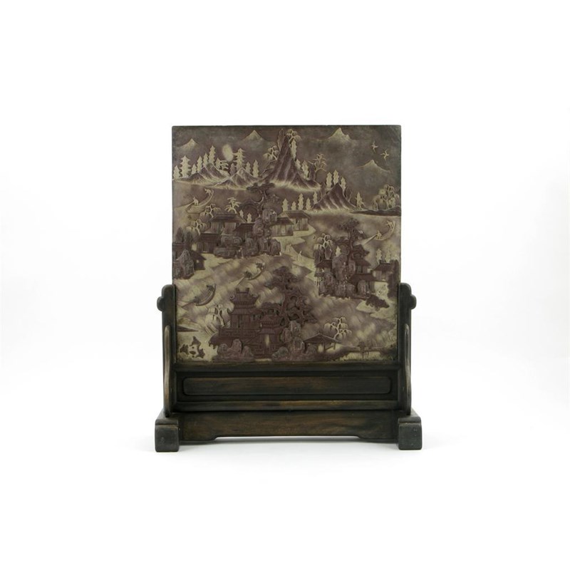 A large Chinese duan stone table screen, 19th / 20th century. Carved in relief with a scene depicting fisherman casting their nets with Chinese huts, rockwork and pine trees with distant mountains, together with a wood stand, minor damages and chips, 50.5cm over all. (2)