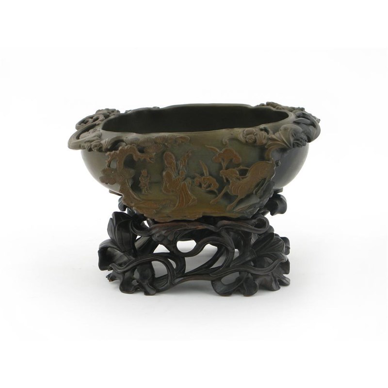A Chinese duan stone brushwasher, 19th / 20th century. The exterior carved with Shoulao holding a peach and with a deer holding a lingzhi fungus, the rim with bats and chilong dragons, all raised on a high carved wood stand, 25cm wide. (2)