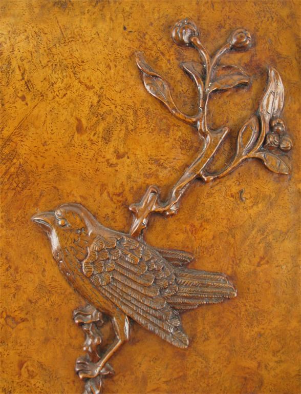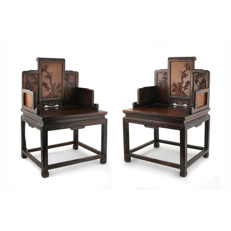 A good pair of huanghuali and burr elm armchairs, 18th century. The backs and arms inset with five panels carved in high relief with birds perched on flowering branches issuing from rocks, the aprons crisply carved with stylized taotie masks and raised on straight legs terminating in square scrolls, some restoration, 89.5cm. (2)