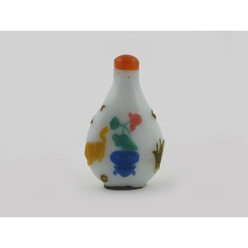 A Chinese white Beijing glass snuff bottle, 18th / early 19th century. Overlaid in blue, green, pink, brown and yellow, with animals, fruits and auspicious things, 6.5cm.