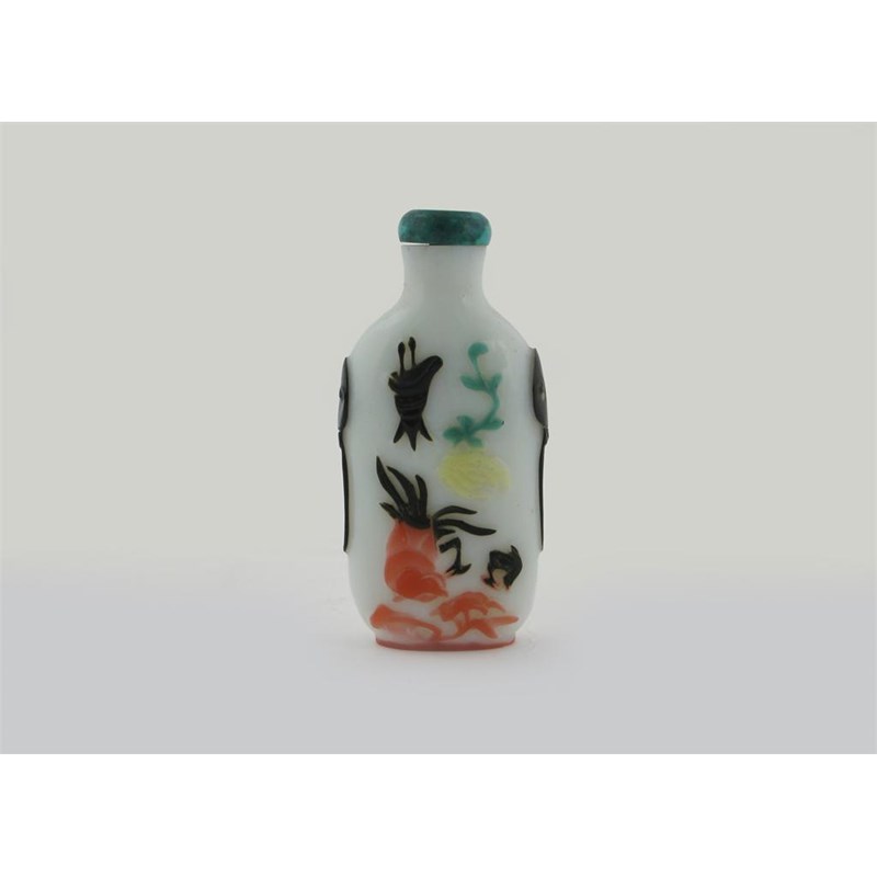 A Chinese overlaid Beijing glass snuff bottle, 18th century. Decorated in green, yellow, brown, pink, purple and orange, with auspicious objects, 7.5cm.