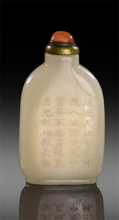 A Chinese white jade inscribed snuff bottle, Qianlong mark and of the period 1736-95. One side finely carved with four figures and a tiger, the reverse carved with five columns of calligraphy, the stopper coral, 6.4cm.