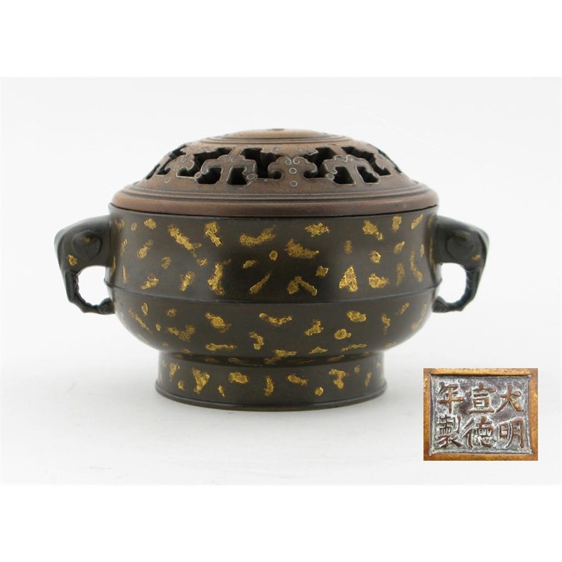 A Chinese bronze gold splash incense burner, six character Xuande mark but 18th century. With elephant head handles, the wood cover inlaid with silver wire, the cover cracked and with a knop lacking, 15cm. (2)