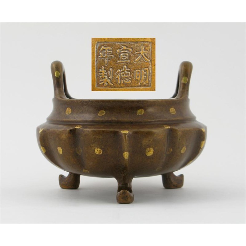 A Chinese gold-splash incense burner, six character Xuande mark but 18th / 19th century. The rim with loop handles, the moulded body raised on three feet, 17cm wide.