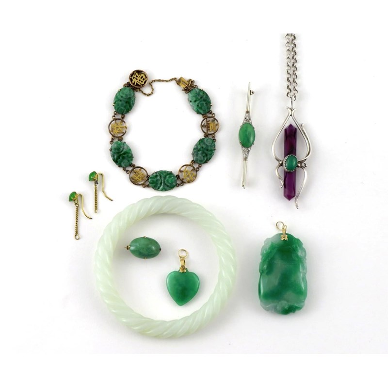 Comprising: a jadeite heart-shaped pendant, a jadeite cabochon mounted as a brooch, a jadeite plaque carved with bats, a gilt metal bracelet mounted with jadeite foliate plaques, a jadeite tie pin, a pale celadon hardstone bangle carved as twisted rope, a silver-coloured metal pendant mounted with jadeite and purple hardstone, and a pair of green glass earrings, 8.8cm max. (9)