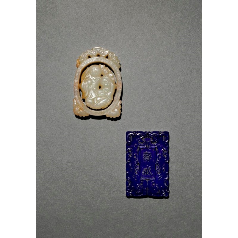 One in celadon jade, carved with a revolving oval panel of two figures, the other an abstinence plaque, one side marked zhai jie in Chinese, the other with the Manchu characters bolgomi karga, 6.5cm. (2)