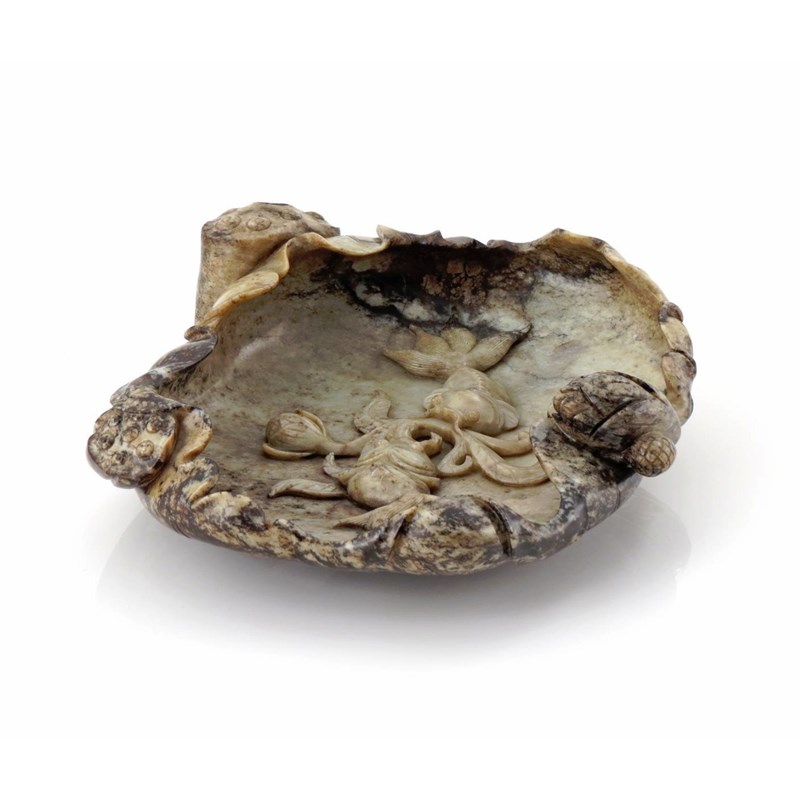 Formed as a large curling lotus leaf, with flowers and seed pods to the rim, the interior with two moor fish swimming with a single stem, the stone with black and cream mottling, 26cm.