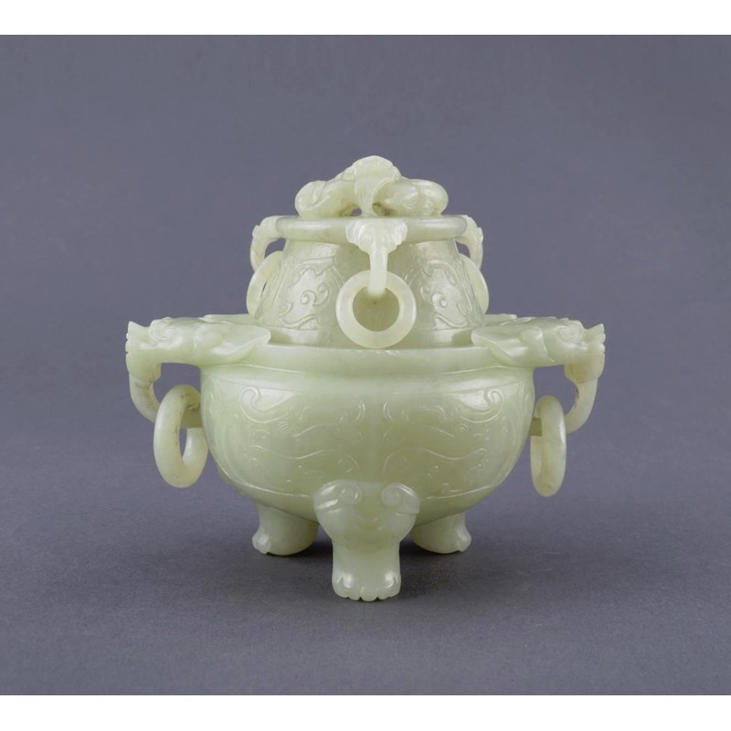 The compressed circular body carved in relief with taotie masks and with two dragon head handles, each supporting a loose ring, all supported on three lion dog mask feet, the cover with further loose rings, the finial formed as a sinuous curled chilong, 11.2cm. (2)