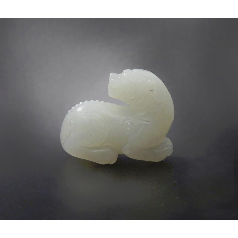 A SMALL CHINESE WHITE JADE CARVING OF A KYLIN QING DYNASTY OR LATER In a recumbent position