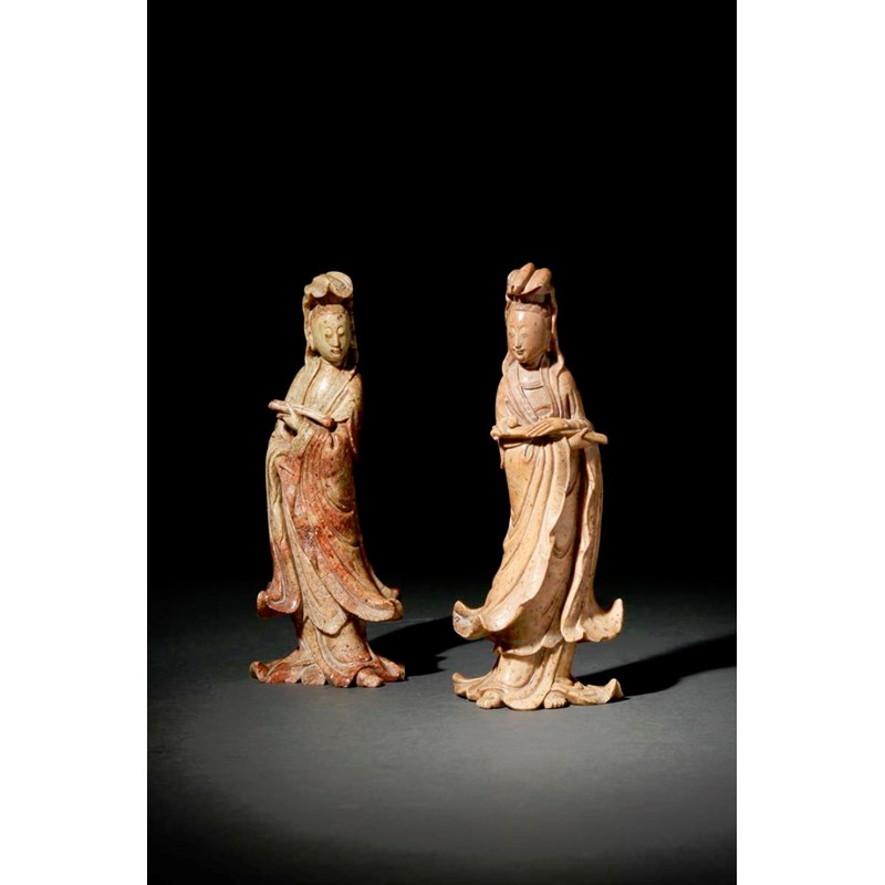 A PAIR OF CHINESE SOAPSTONE CARVINGS OF GUANYIN
