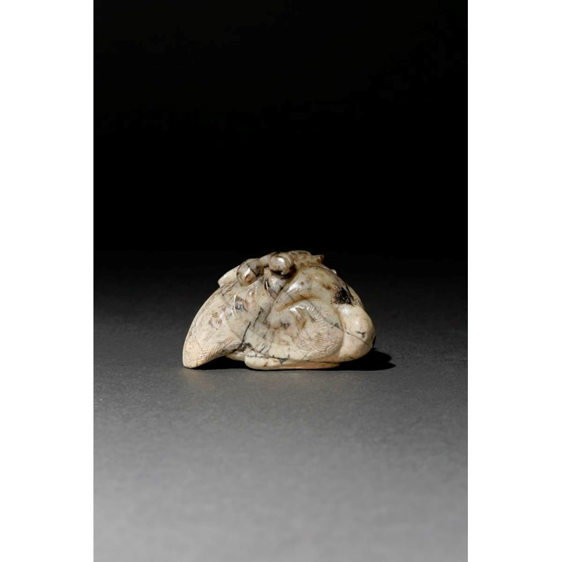 A CHINESE CALCIFIED JADE CARVING OF A CRANE LATE QING DYNASTY Sitting with its head turned and...