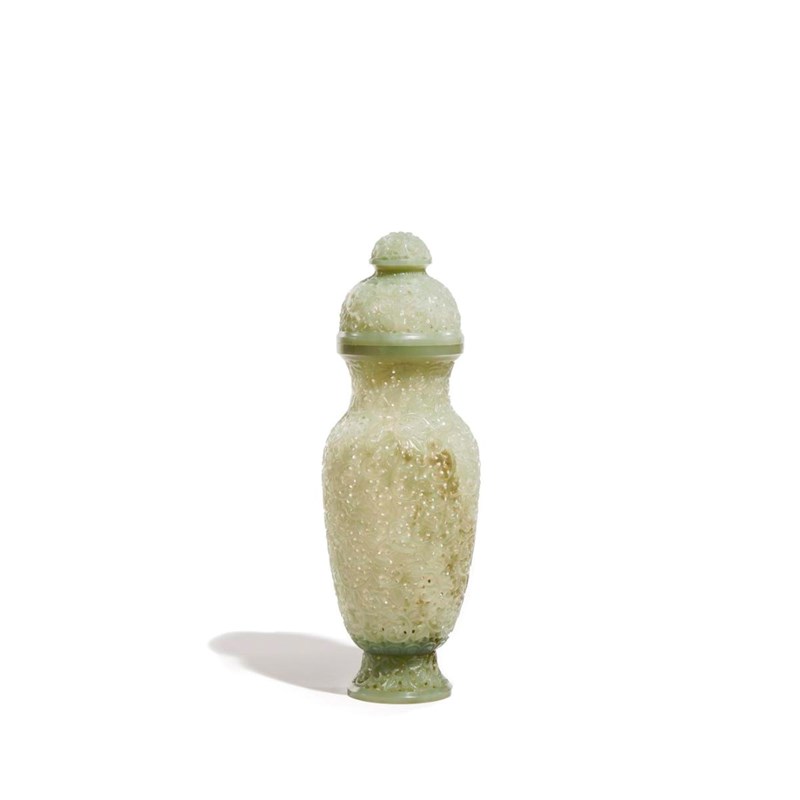 A CHINESE CELADON JADE RETICULATED VASE AND COVER 20TH CENTURY The body intricately carved with...