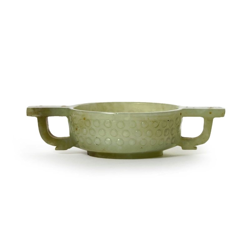A SMALL CHINESE CELADON JADE TWO-HANDLED CUP