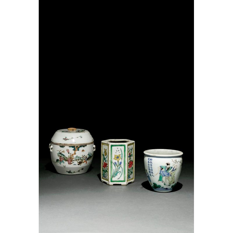 Painted with figures in a fenced garden with rockwork, with two columns of calligraphy, together with a hexagonal famille rose bitong painted with panels of foliate sprays, and a pot and cover painted with boys engaged in outdoor pursuits, 14cm max. (4)