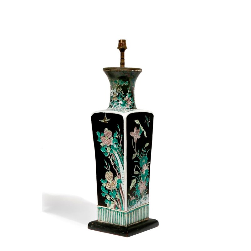 Painted with panels of prunus, chrysanthemum, lotus and peony, with small birds in flight, mounted as a lamp, undrilled, 50cm.