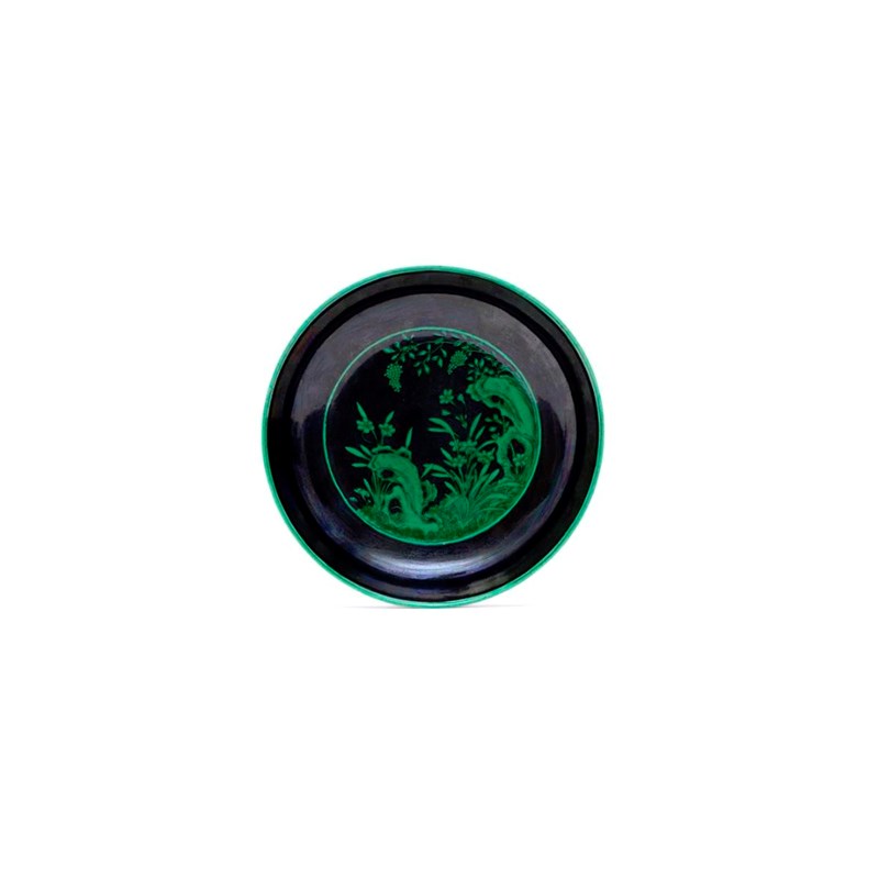 A RARE CHINESE BLACK GROUND AND GREEN ENAMELLED DISH