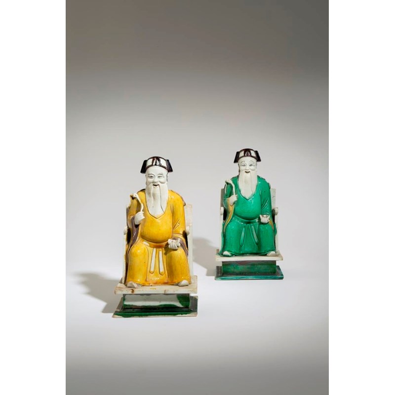 Each with a long beard and a happy expression, seated on a throne raised upon a rectangular plinth, holding a fly whisk in one hand, a small pot in the other, decorated with yellow, aubergine and green glazes, 26cm. (2)