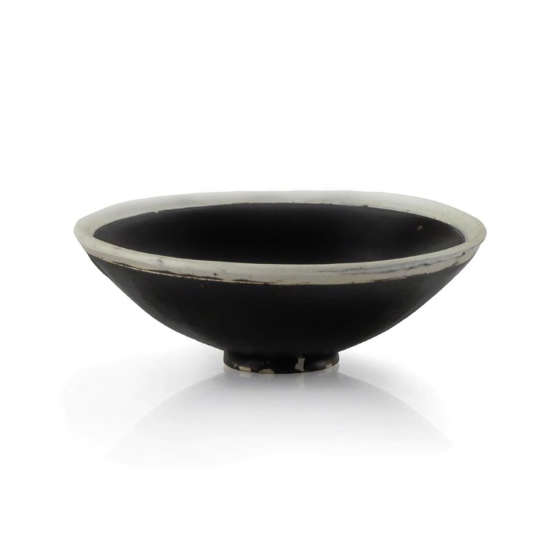 The wide conical body decorated with a dense black glaze, the rim with a thick white band, the foot unglazed, 14.2cm.