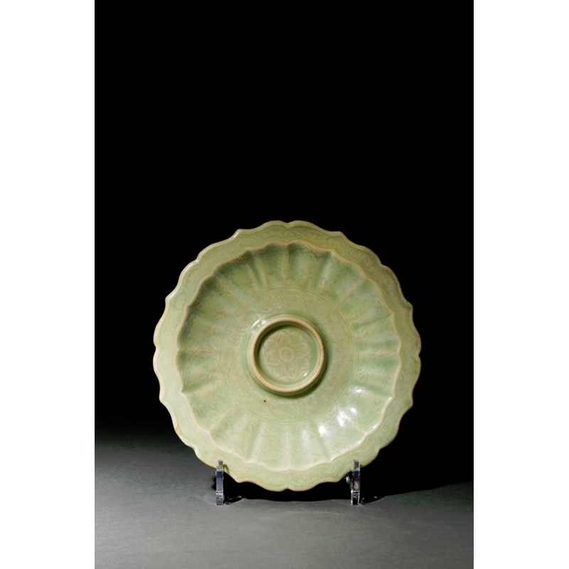 A GOOD CHINESE LONGQUAN CELADON GLAZED STAND EARLY MING DYNASTY The shallow body moulded with...