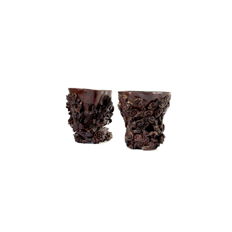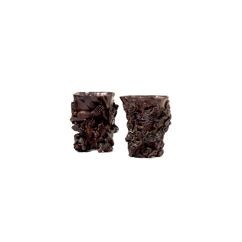 A RARE PAIR OF CHINESE CHENGXIANGMU DRAGON AND PHOENIX LIBATION CUPS LATE MING/EARLY QING DYNASTY...