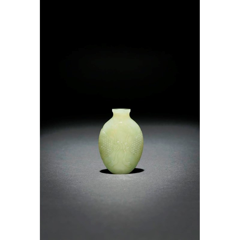A CHINESE YELLOW JADE SNUFF BOTTLE QIANLONG 1736-95 The flattened ovoid body carved in shallow...