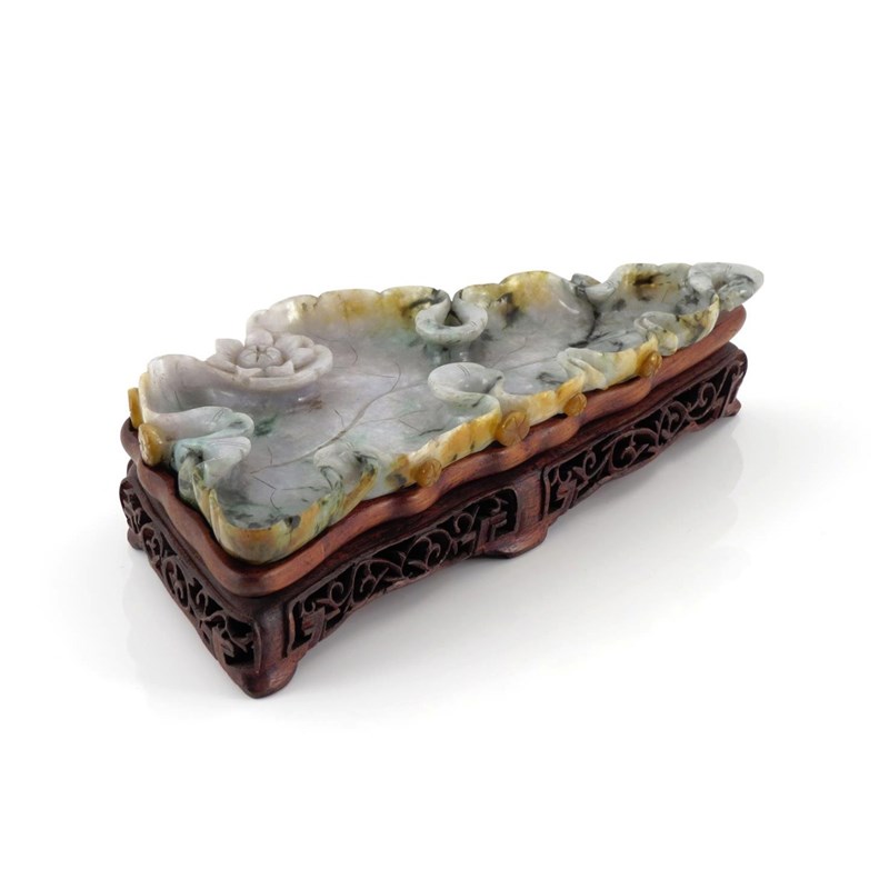 Formed as a large leaf, the edges curling inwards, a single flowerhead to one edge, the stone with green and russet mottling, raised on a fitted scrolling reticulated stand, 25.2cm. (2)