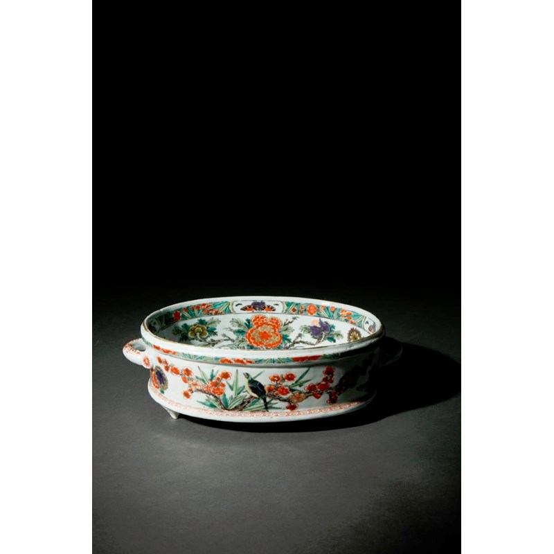 A CHINESE FAMILLE VERTE TWO-HANDLED OVAL DISH KANGXI 1662-1722 Raised on three pointed feet