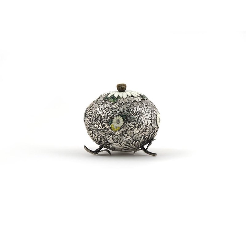 A Japanese silver and enamel covered vase Meiji 1868-1912, formed as a multitude of moulded flowers and raised on three leaf stalk feet and with a liner, 10.5cm across. (3)