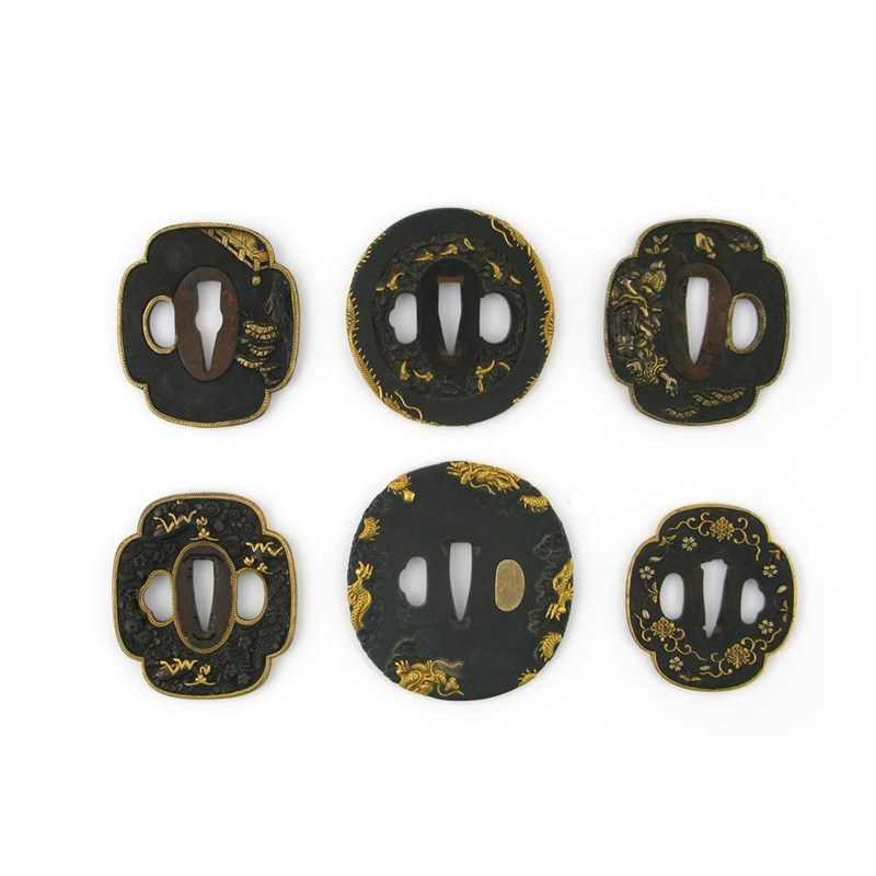Six Japanese tsuba  19th century, in bronze with gold inlay, elaborately decorated with flowers, insects, dragons and figures, 8cm max. (6)