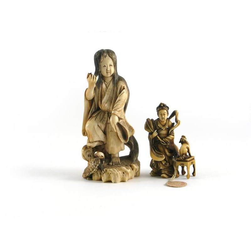 Two Japanese ivory okimono 19th century, one of a lady with a Uchiwa, signed Hidechika, the other of a lady with a minogame, the former from the Tomkinson collection, 11.2cm. (2)