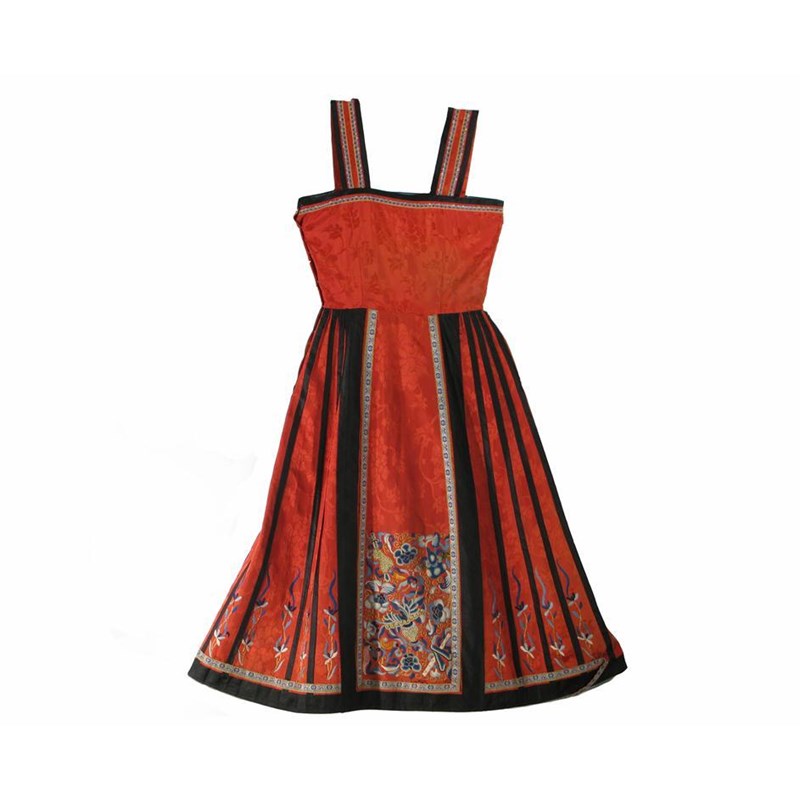 A Chinese red silk dress c.1900, and a small red silk bolero, 120cm max. (2)