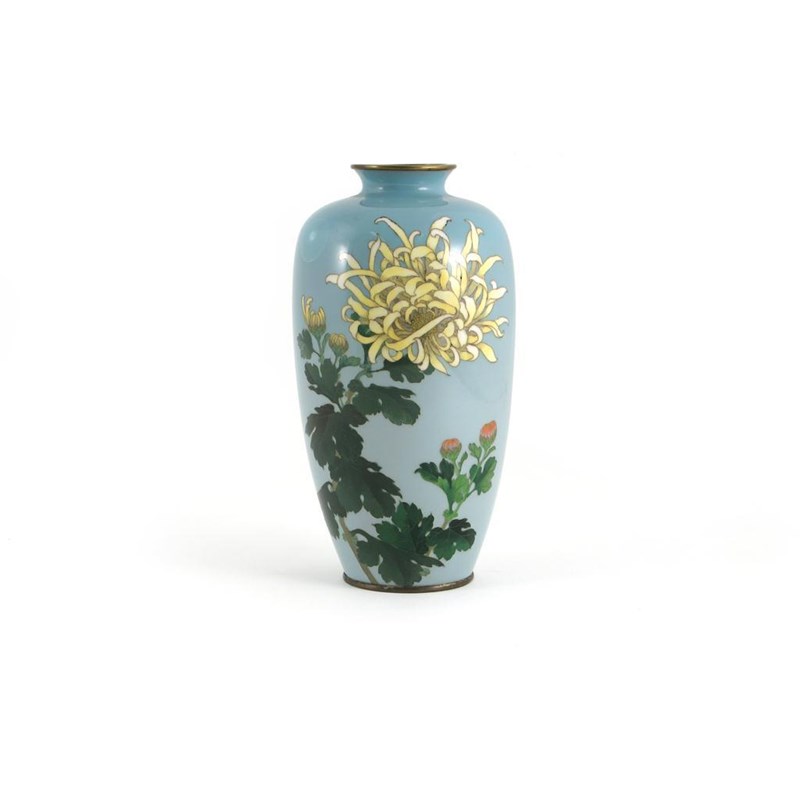A Japanese cloisonné ovoid vase early 20th century, decorated with a large chrysanthemum on a dove grey ground, impressed factory mark, some damages, 18.7cm.
