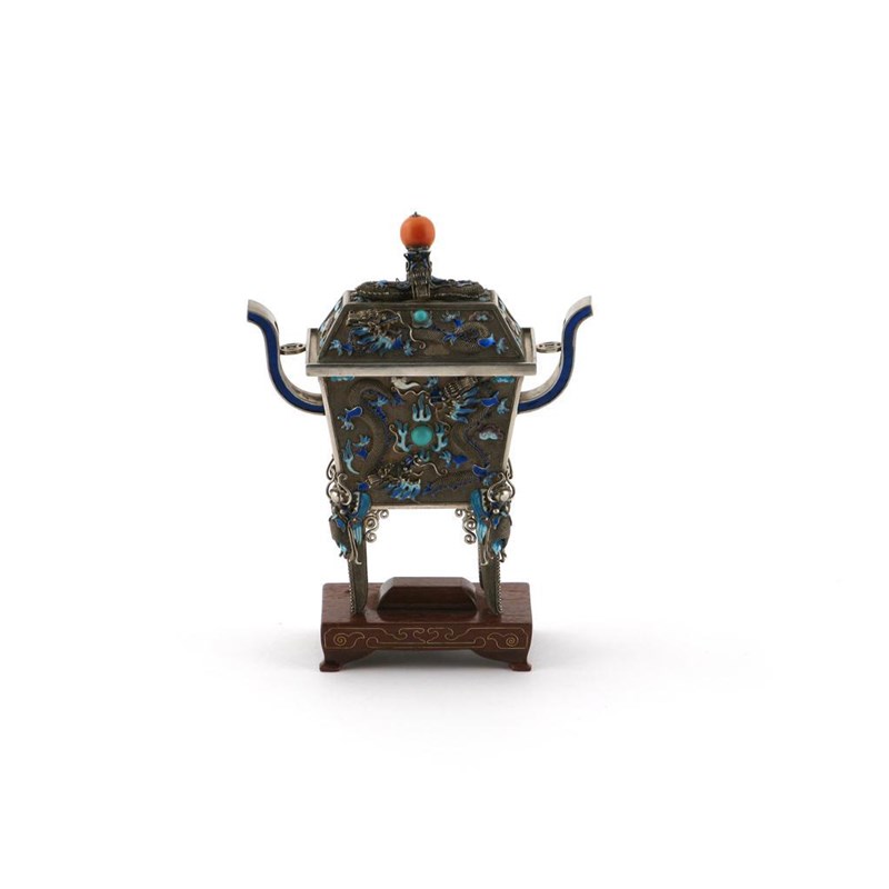 A Chinese silver filigree and enamel ding 20th century, the rectangular body modelled in relief with dragons pursuing pearls, all raised on tall dragon head capped legs, the base stamped 'Silver', together with a hardwood stand, 16cm. (3)