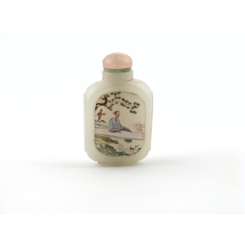 A Chinese opaline glass snuff bottle c.1830, decorated with painted panels, one of figures in a garden, the other with four lines of calligraphy, 7.6cm.