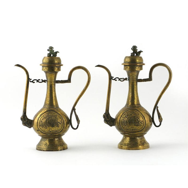 A pair of Chinese brass ewers and covers 16th / 17th century, of Islamic form, decorated with panels containing figures, the necks with bats and clouds, the spreading feet with fish and sea monsters, damages, 30cm. (4)