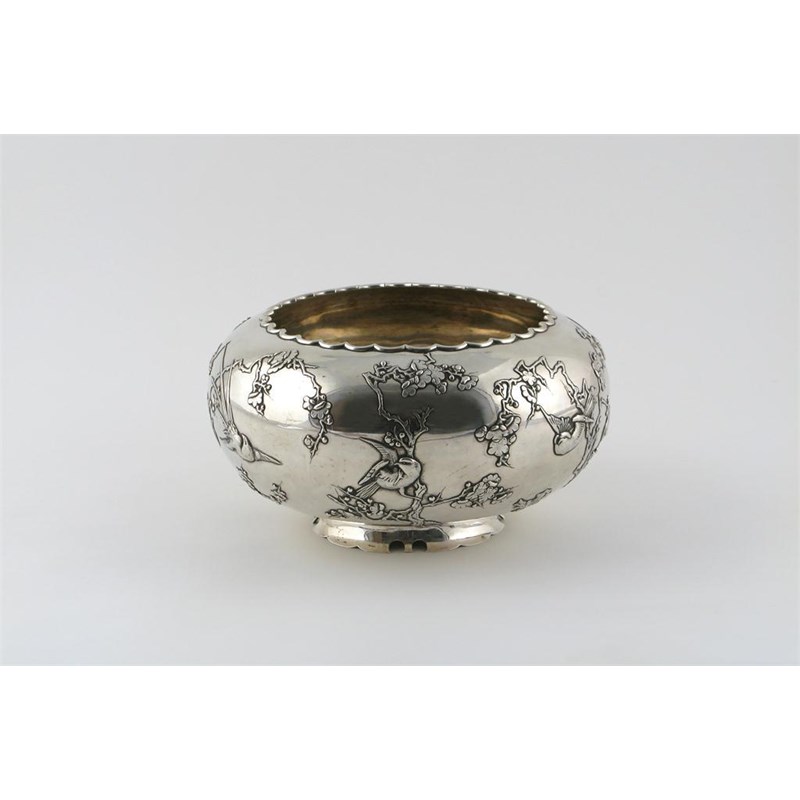 A Japanese silver bowl Meiji 1868-1912, decorated with birds perched in flowering prunus branches, punch marks to the base, 26.5cm.