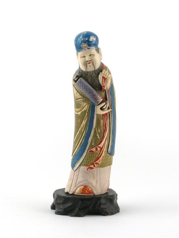 A Chinese painted ivory model of a sage 20th century, standing wearing flowing robes and holding a scroll, 24cm.