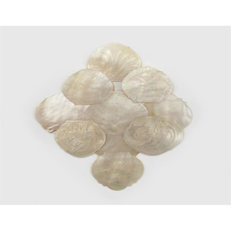 Eleven Chinese mother of pearl box covers and bases 18th / 19th century, three with erotic subjects, one of which is inscribed, one with a chariot pulled by winged horses, two with clasped hands, one as a scallop and four undecorated, 8.1cm max. (11)