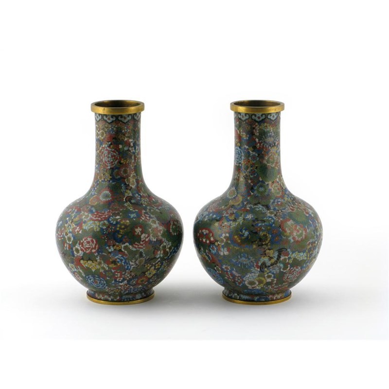 A pair of Chinese cloisonné bottle vases 19th century, decorated with a millefleurs design, 26.5cm. (2)
