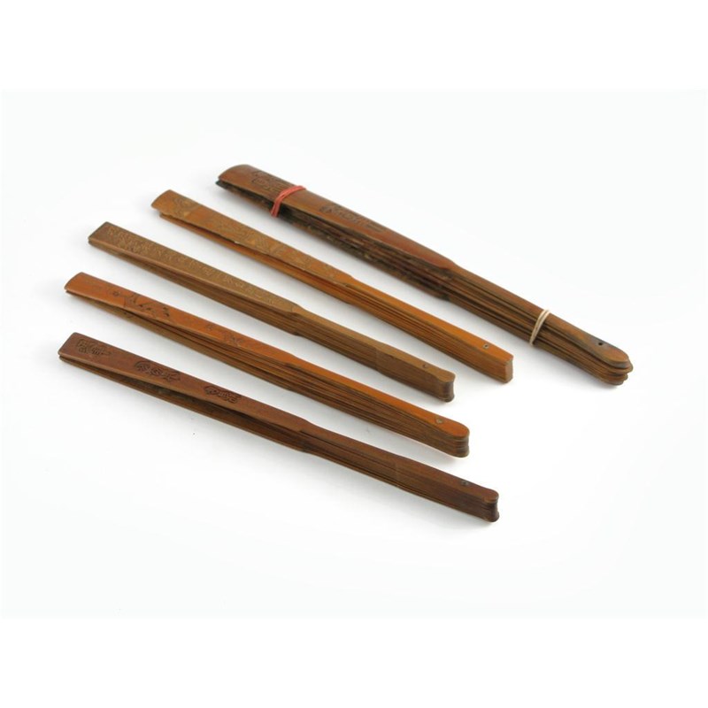 Five Chinese bamboo and wooden fan ends 19th century, damages, 34.5cm max. (5)