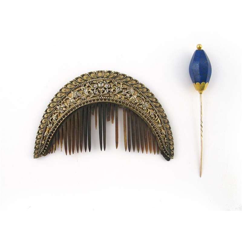 A Chinese lapis lazuli and gold hat pin 19th / 20th century, with a vivid blue faceted bead and a silver gilt comb chased with flowers, birds and foliage, the tortoiseshell comb damaged, 10.5cm. (2)