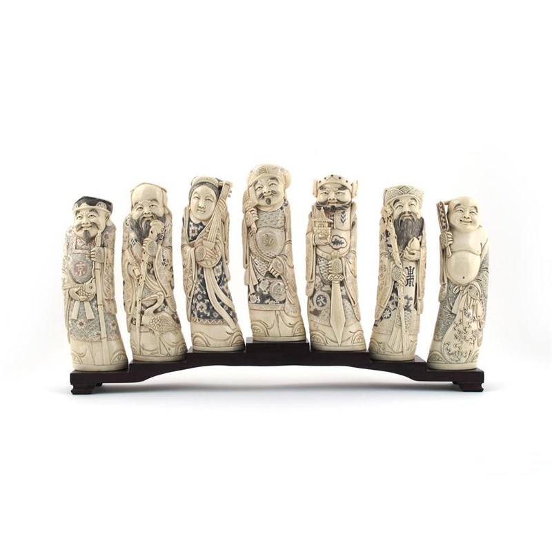 A set of seven large ivory carvings of Immortals 20th century, standing with their robes engraved and picked out in black and red, together with a wood stand, 25.5cm. (8)