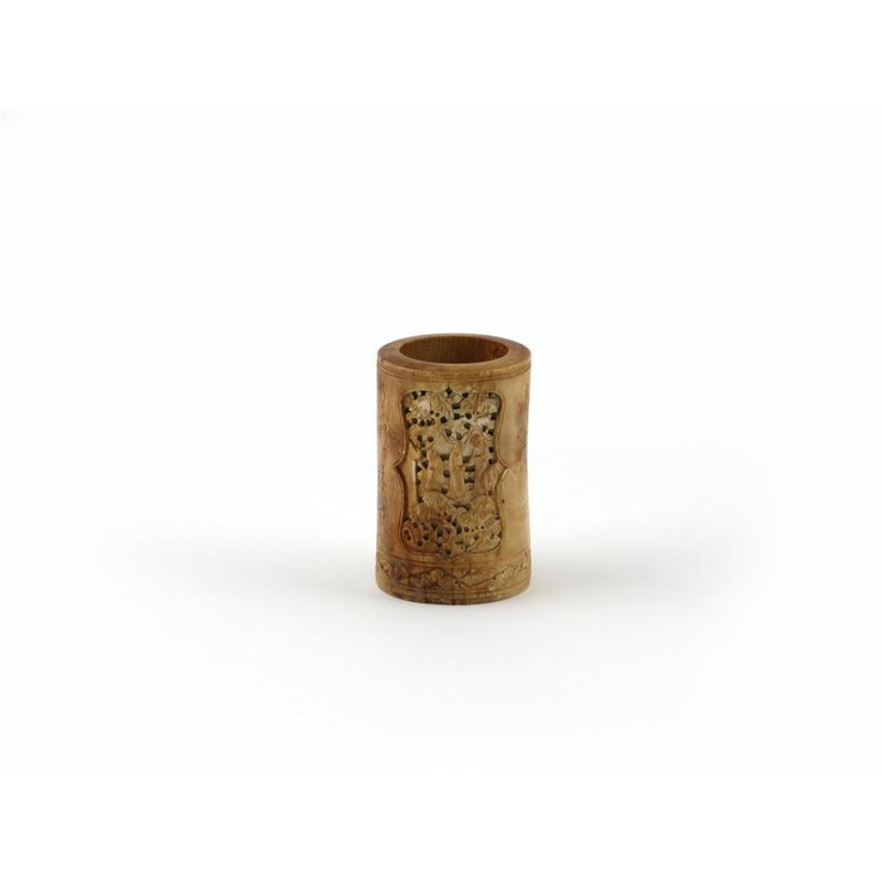 A small Chinese ivory brush pot 19th century, carved with two cartouches containing figures divided by columns of calligraphy, 8.4cm.