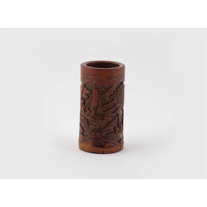 A small Chinese bamboo brush pot 19th / 20th century, carved with figures in boats in a watery mountain landscape, 12cm.