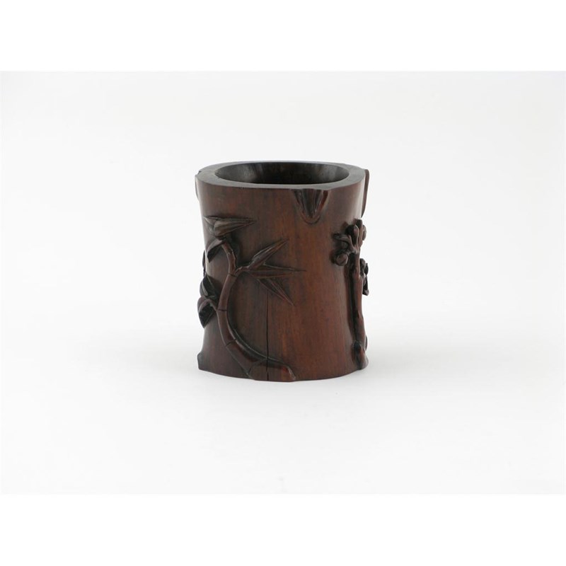 A Chinese hardwood brush pot 19th / 20th century, formed as a section of tree trunk around which the Three Friends of Winter grow, 11.7cm.
