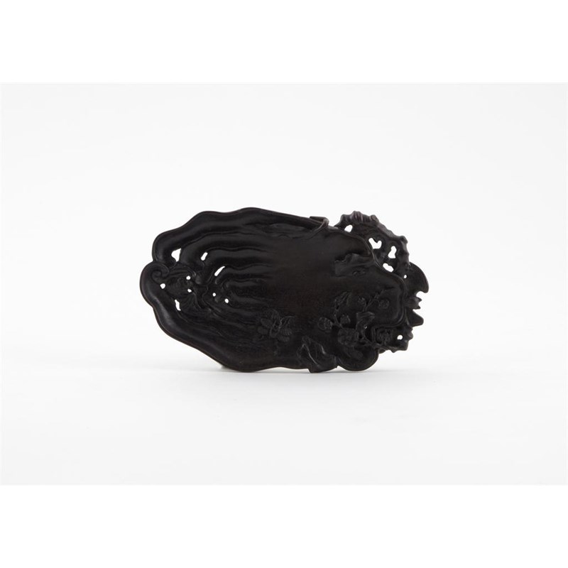 A Chinese zitan shallow dish 20th century, carved as a finger citron upon which two bats and a bee creep, the fruit issuing from a flowering gnarled leafy branch, 15cm.