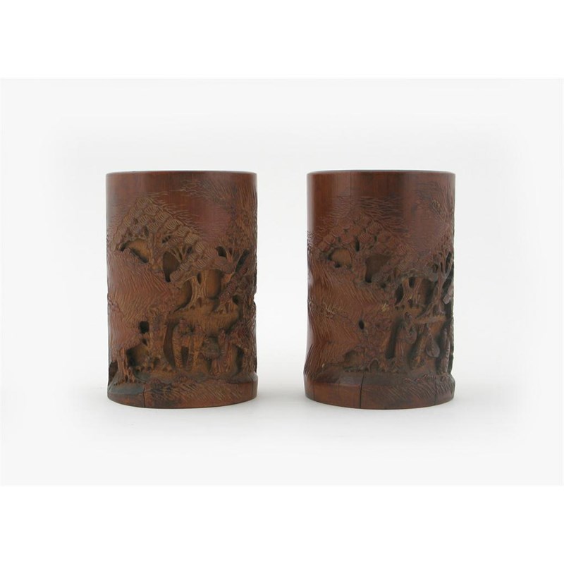 A pair of Chinese bamboo brush pots 19th / 20th century, each deeply carved with groups of figures playing go, in wooded mountain retreats, some splitting, 13cm. (2)