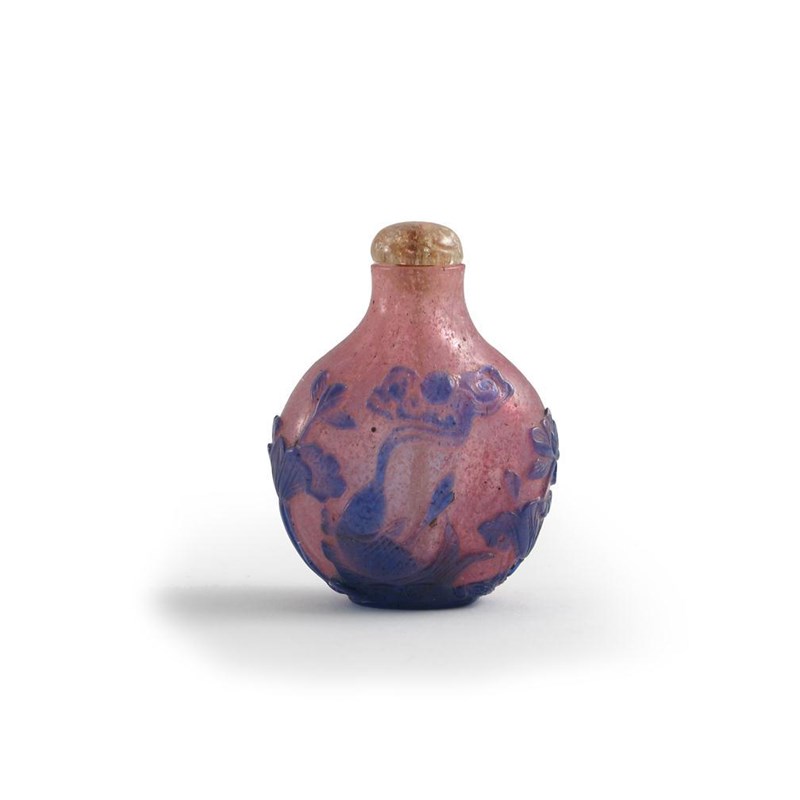 A Chinese blue and pink overlaid glass snuff bottle 18th / 19th century, decorated with a fish spouting ruyi-shaped water sprays, the reverse with a bird above lotus, and a seal, 6cm.