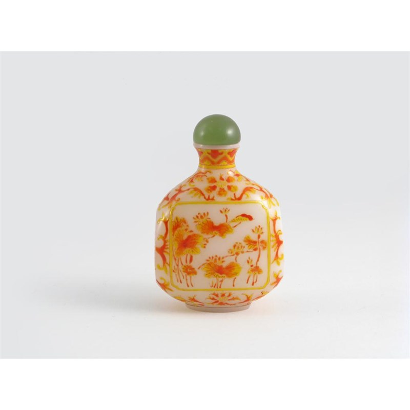 A Chinese opalescent glass snuff bottle 20th century, brightly painted in orange and yellow with fish leaping and lotus, the base with a three character mark, 8.1cm.